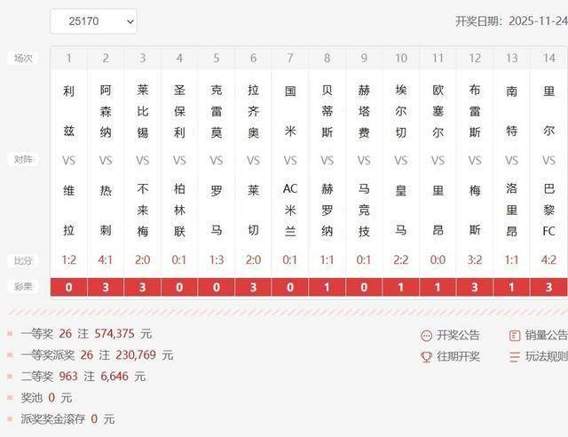 意甲直播,意甲赛程,意甲积分榜,尤文图斯直播,意甲比分预测/面向中文球迷的意甲资讯平台,涵盖2025赛季完整赛程、免费高清直播入口、积分榜更新与竞彩波胆预测,聚焦尤文、国米、米兰三大豪门赛事。北京时间11月24日,足彩第25170期开奖结果揭晓。本期赛事冷门迭出,头奖单注奖金在派奖加持后突破80万元,二等奖及任九奖金也颇为可观,整体销量稳健。
